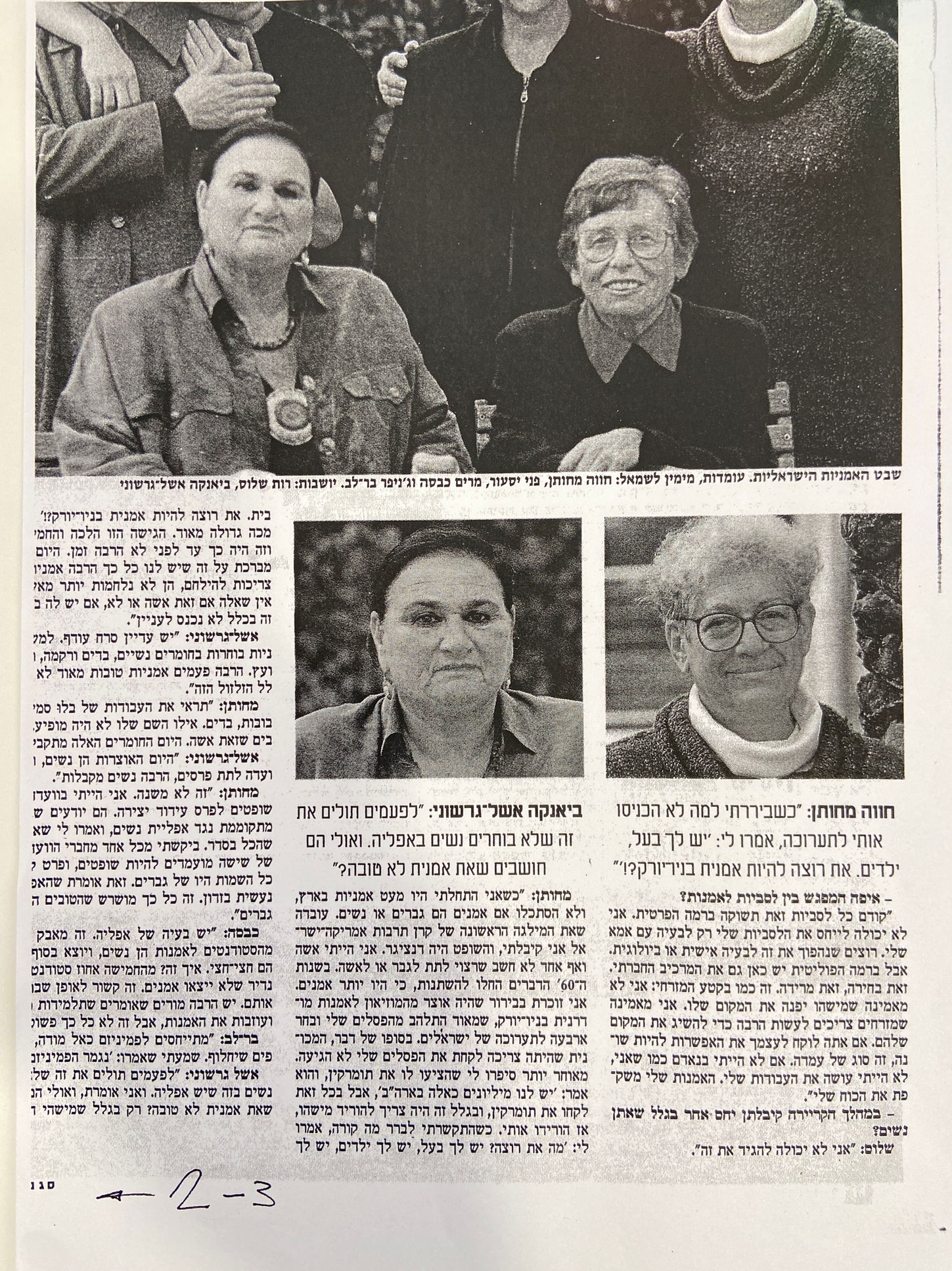 זר שהיה מגיע למקום ומבחין בחבורת הנשים שישבה מסביב לשולחן, היה ודאי חושב שמדובר בבנות משפחה מורחבת, שהתכנסו יחד לרגל אירוע חגיגי. האמת לא רחוקה. הנשים שישבו בבית הקפה התל־אביבי הן אמניות ישראליות מדורות שונים: זקנת השבט, רות שלוס, שנולדה ב־1922 בברלין, החלה את רישומיה החברתיים כבר בשנות ה־40'; חווה מחותן, העוסקת בפיסול באבן ובעץ מאז שנות ה־50'; ביאנקה אשל־גרשוני, שהחלה ליצור בחומרים כמו בד, נוצות, נייר ופרחים בסוף שנות ה־60'; ג'ניפר בר-לב, ילידת 1948, יוצרת עבודות כתב שבהן היא מספרת סיפור על בדים; פני יסעור, ילידת 1950, עוסקת ביציקות של חומרים כבדים, והצעירה שבחבורה, מרים כבסה, ילידת 1966, משתמשת ביצירותיה בכל גופה. האירוע: התערוכה המקיפה ביותר של אמניות בישראל, בה משתתפות 72 אמניות מ־50 שנות המדינה. התערוכה נפתחה בחיפה ב־14 בפברואר, והיא תוצג עד ה־8 במרס – יום האשה הבינלאומי. האווירה המשפחתית במפגש היא מהסוג הנעים: פרגון אמיתי שלא רואים הרבה במקומותינו. וחום, הרבה חום.